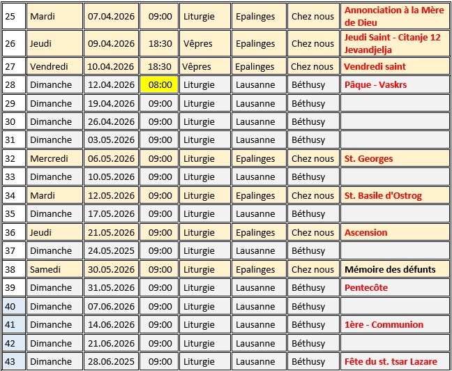 Horaires des cultes à Lausanne, Epalinges et Sierre (Chippis), pour 2026